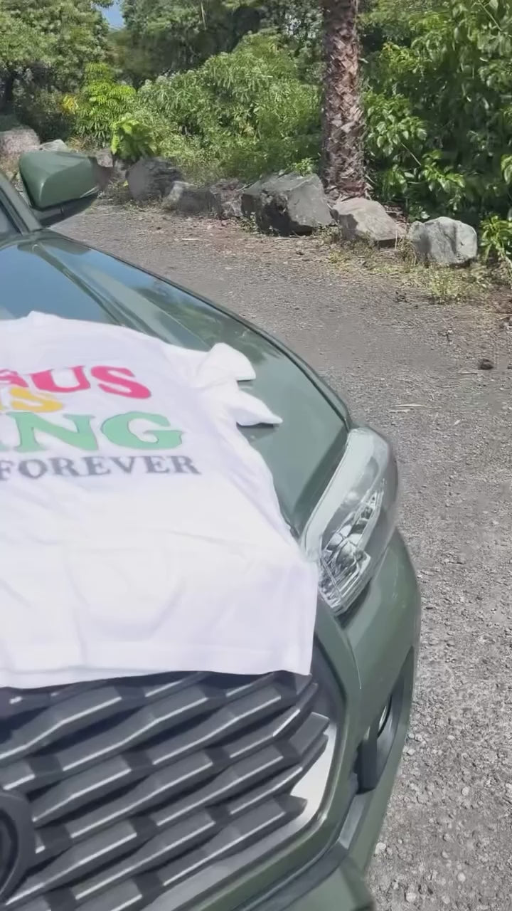 White t-shirt with 'Jesus is King Live Forever' text in red, yellow, and green on a white background